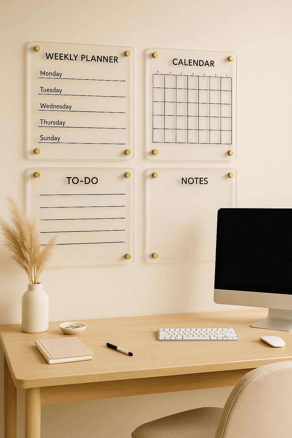 Each frame is built from two layers of crystal-clear, premium acrylic (⅛″ each, ¼″ total thickness) for gallery-grade strength and brilliance. The floating mount design with brushed metal standoffs creates dimensional depth and a minimalist finish that complements any setting—from home studios to professional offices to university corridors.